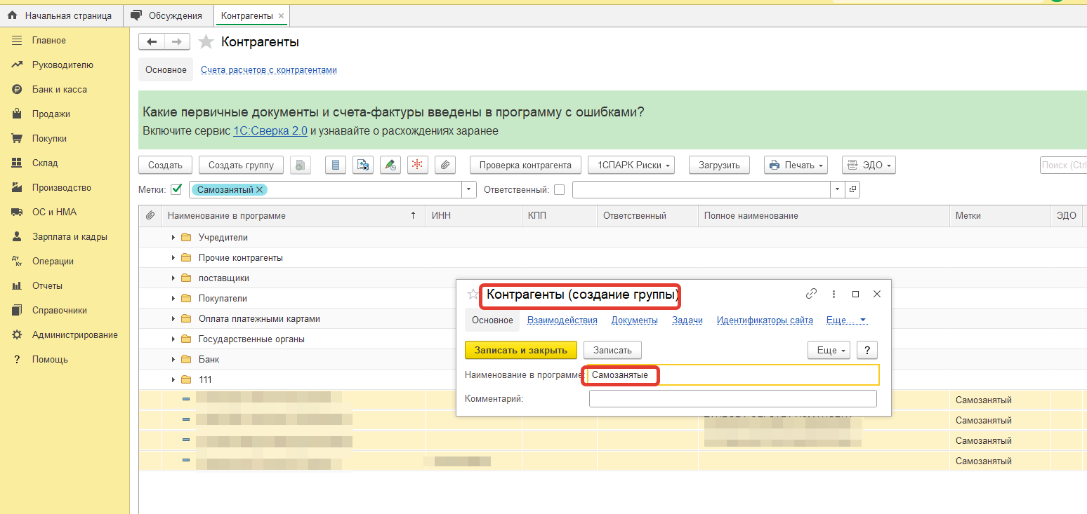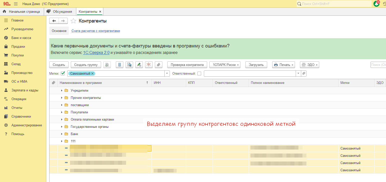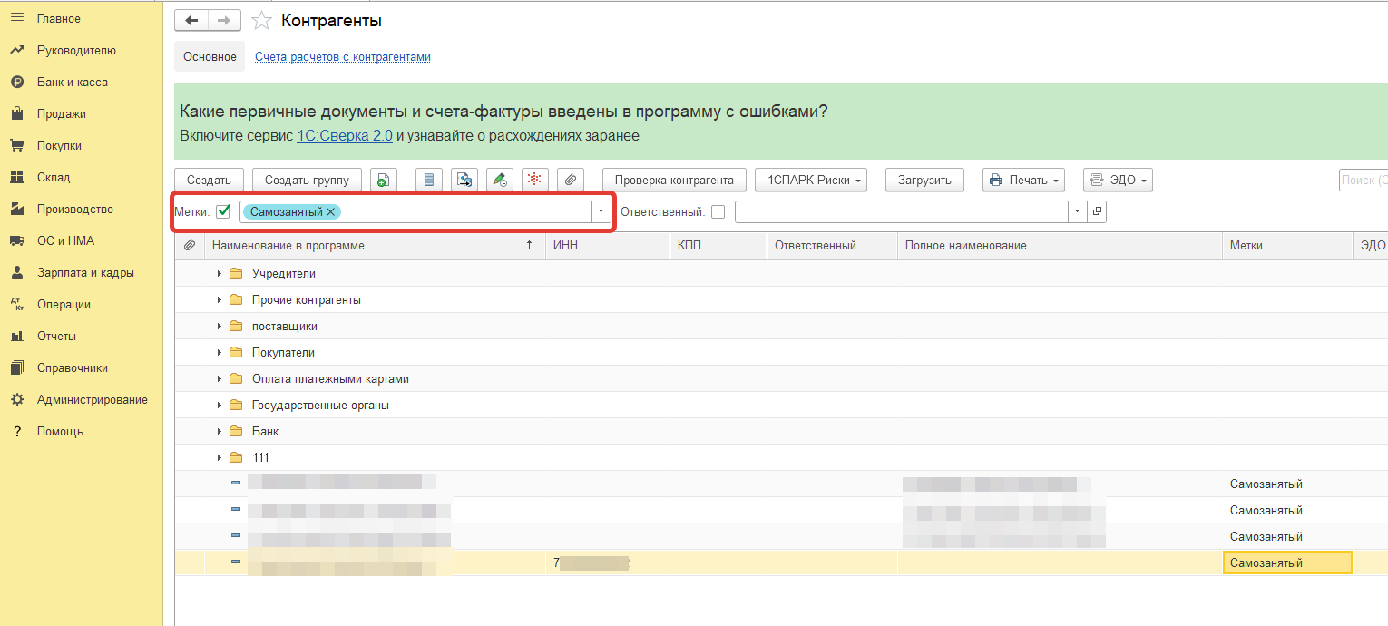 Теперь все самозанятые с меткой находятся в отдельной папке справочника Контрагенты.
