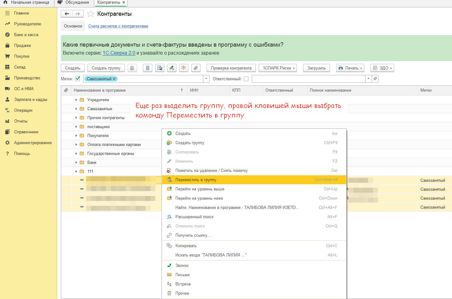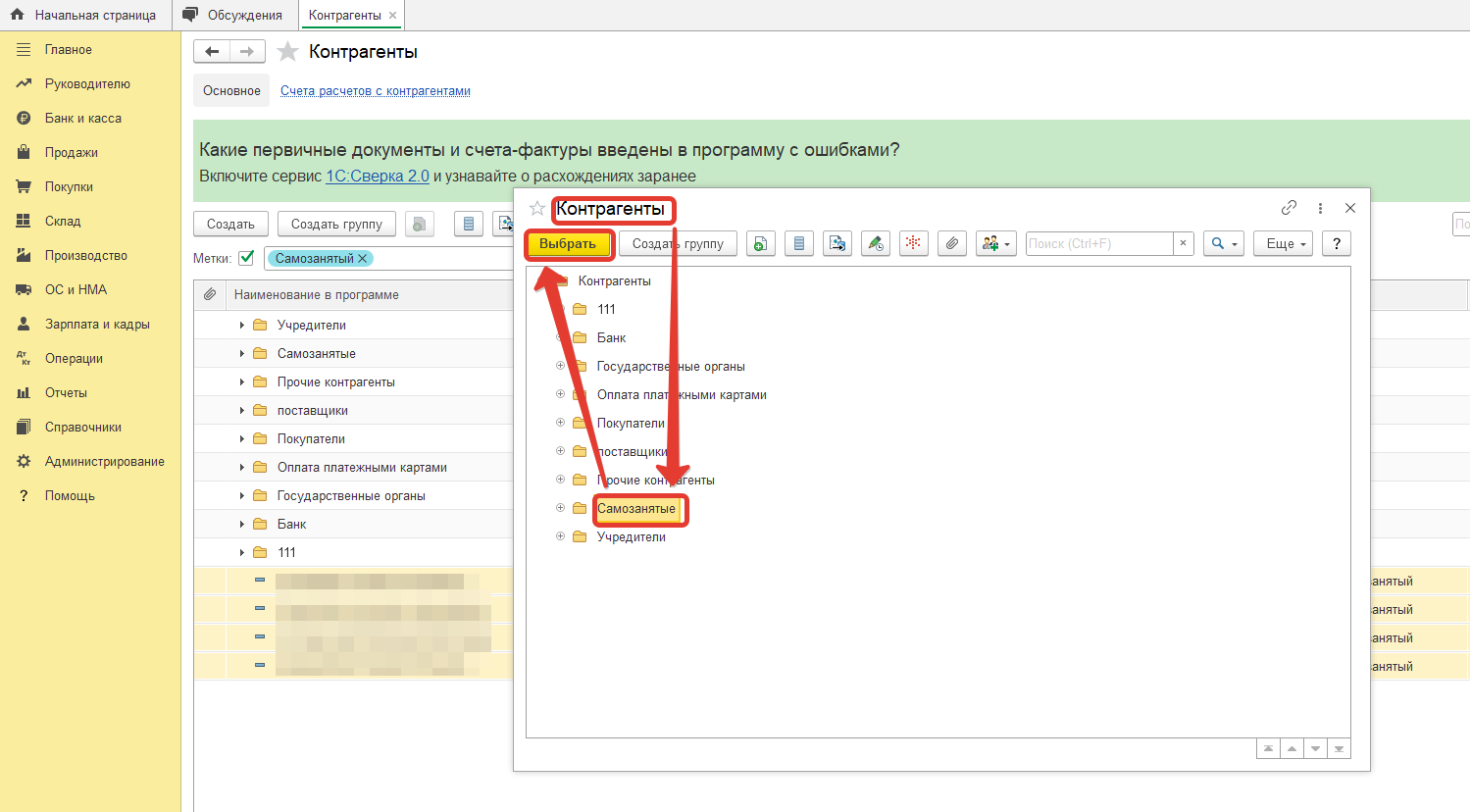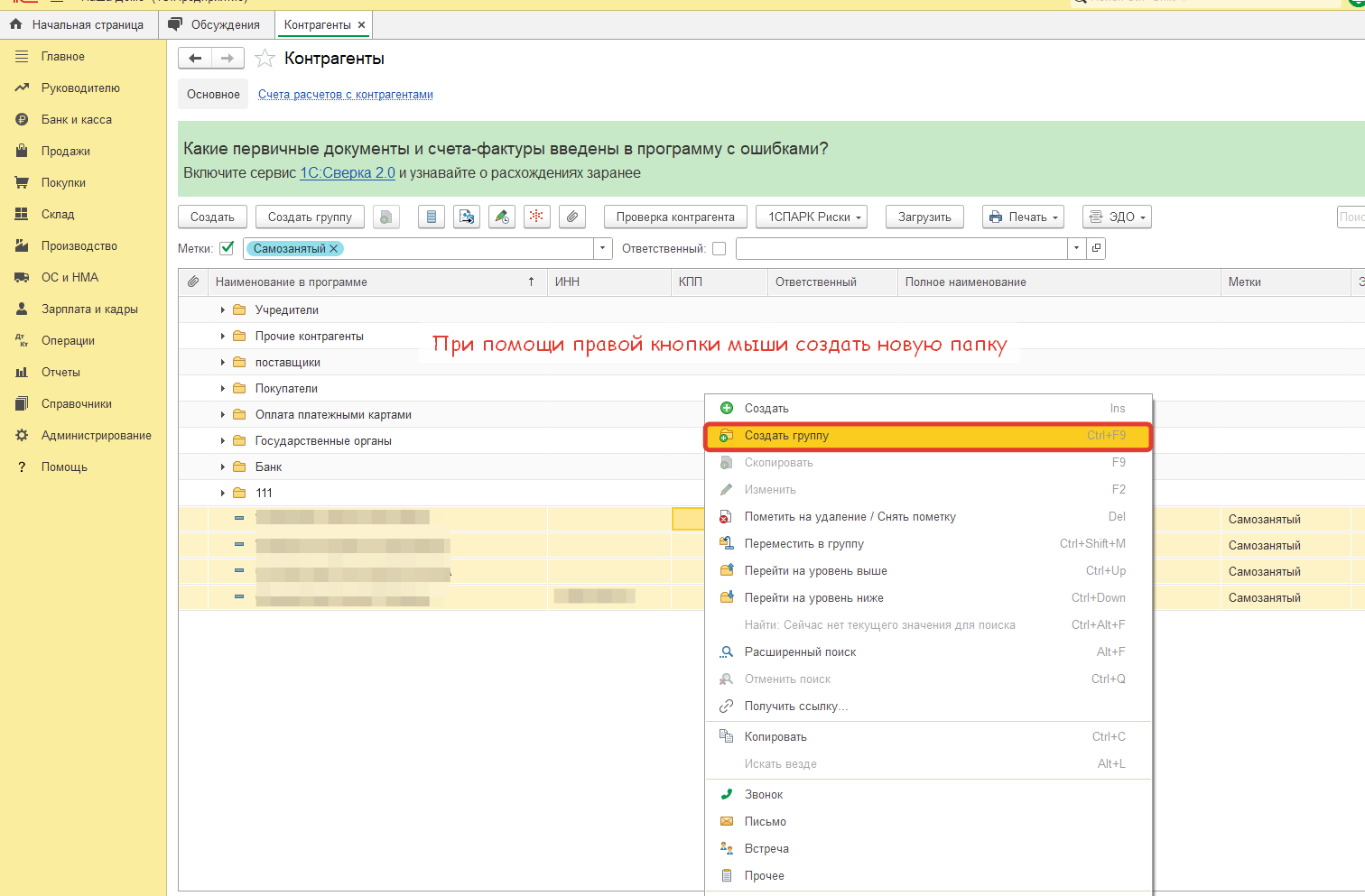 Теперь все самозанятые с меткой находятся в отдельной папке справочника Контрагенты.