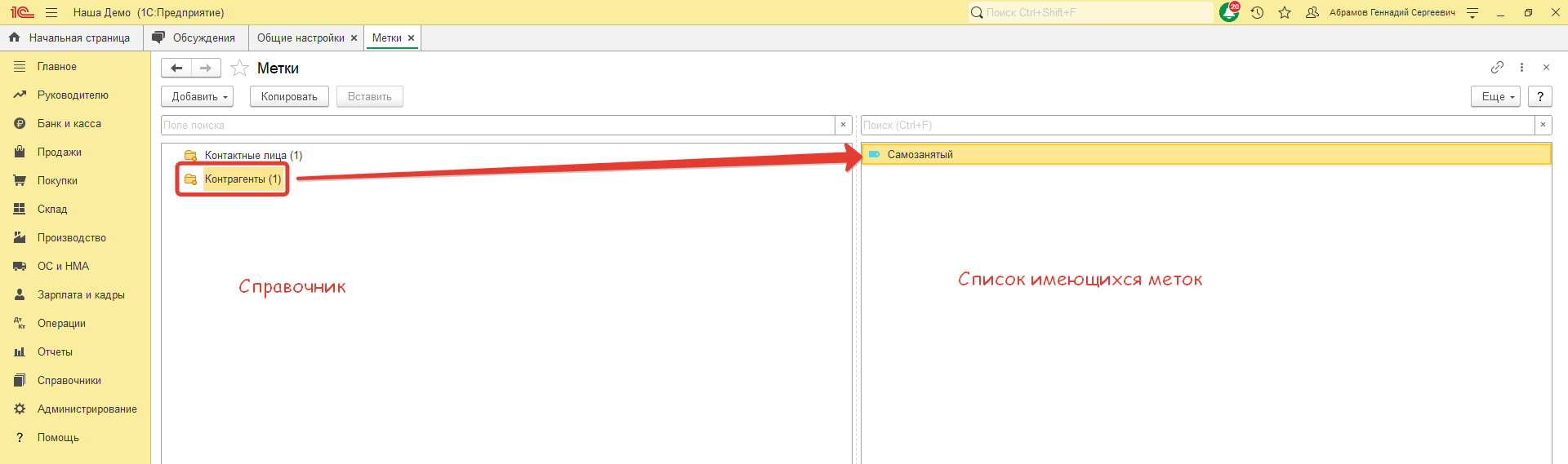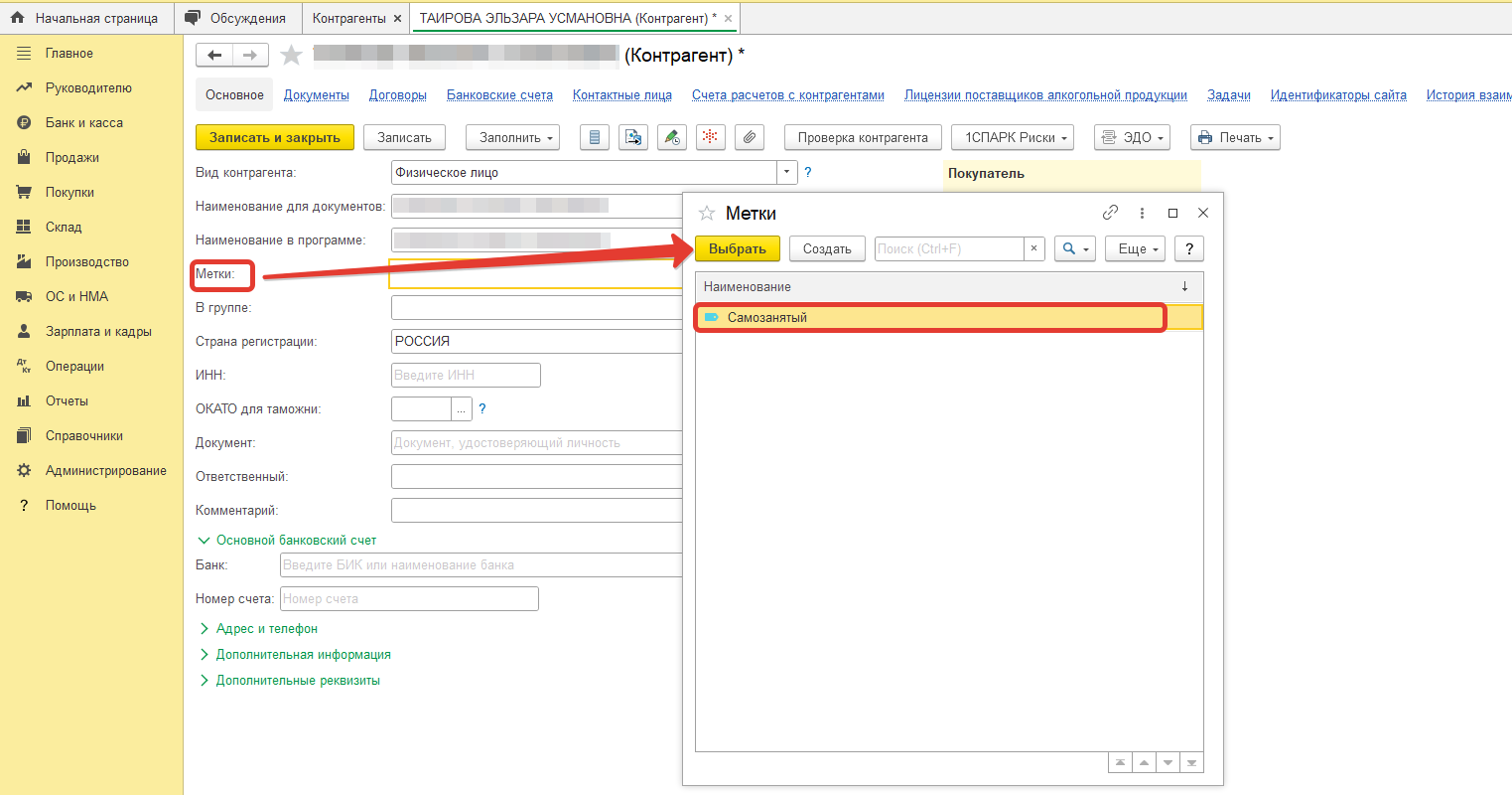 Теперь можно присваивать метки самозанятым в карточках контрагентов.