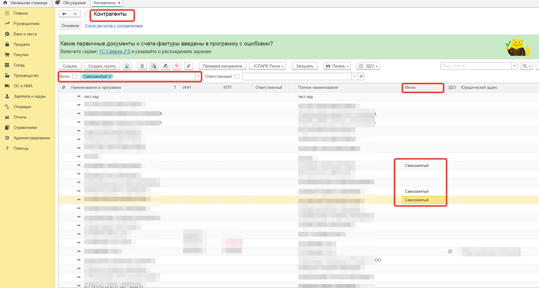 Т.е. при необходимости мы можем отобрать всех контрагентов с меткой Самозанятый.