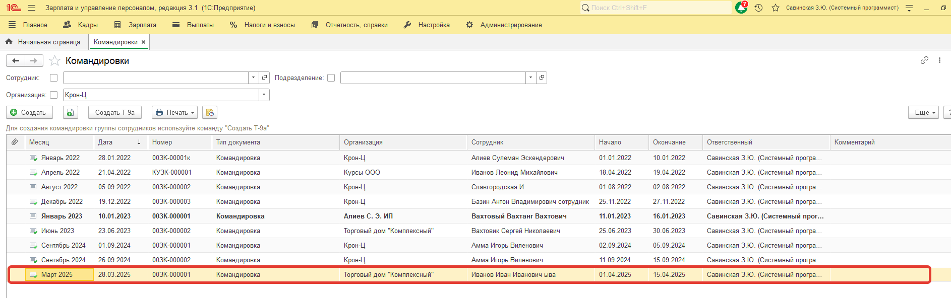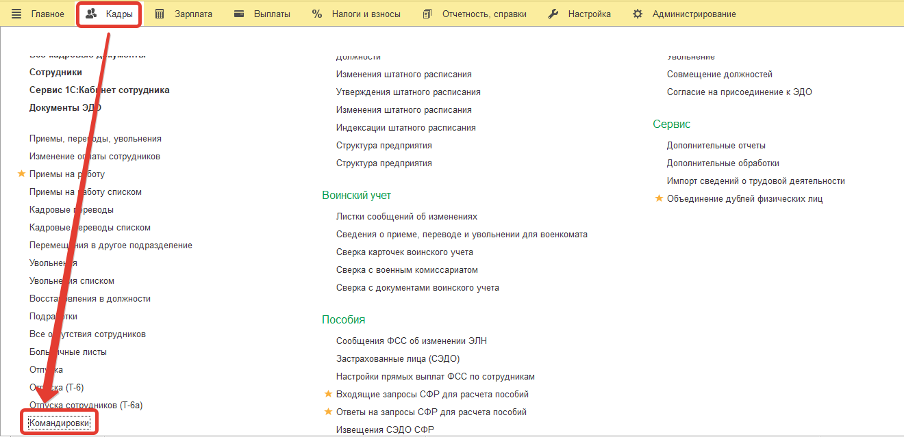 После проверки либо настройки данного функционала появится возможность работы с документом Командировка, и, соответственно, возможность распечатать Командировочное удостоверение по форме Т-10.