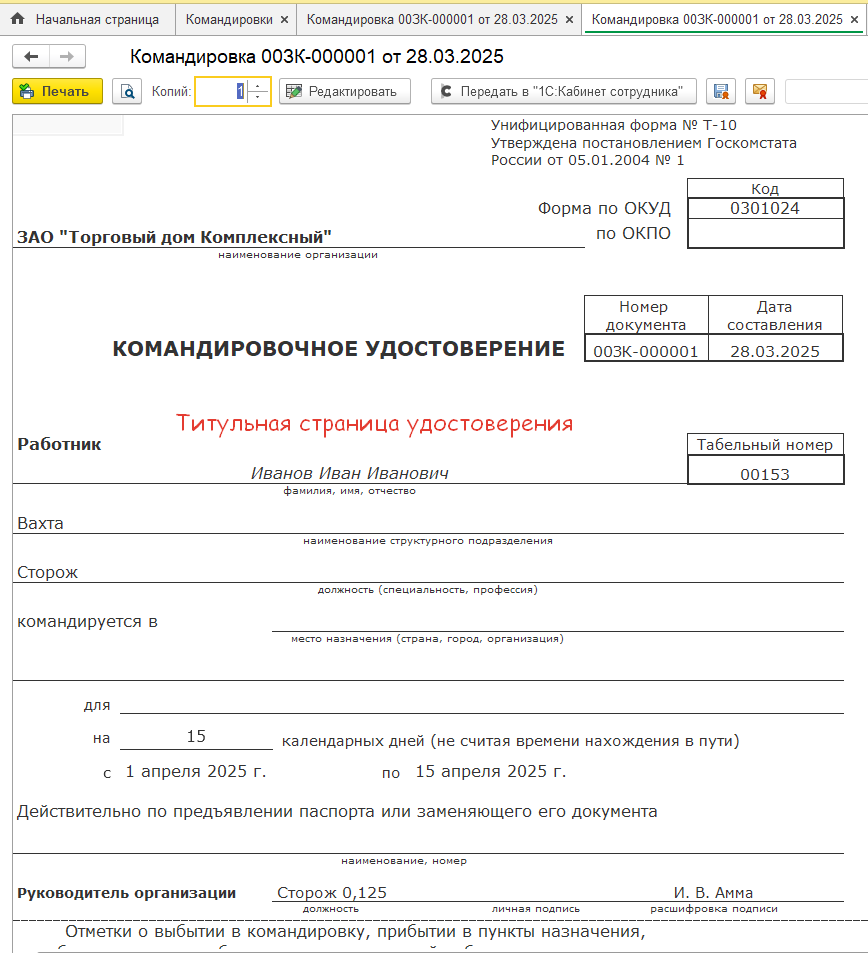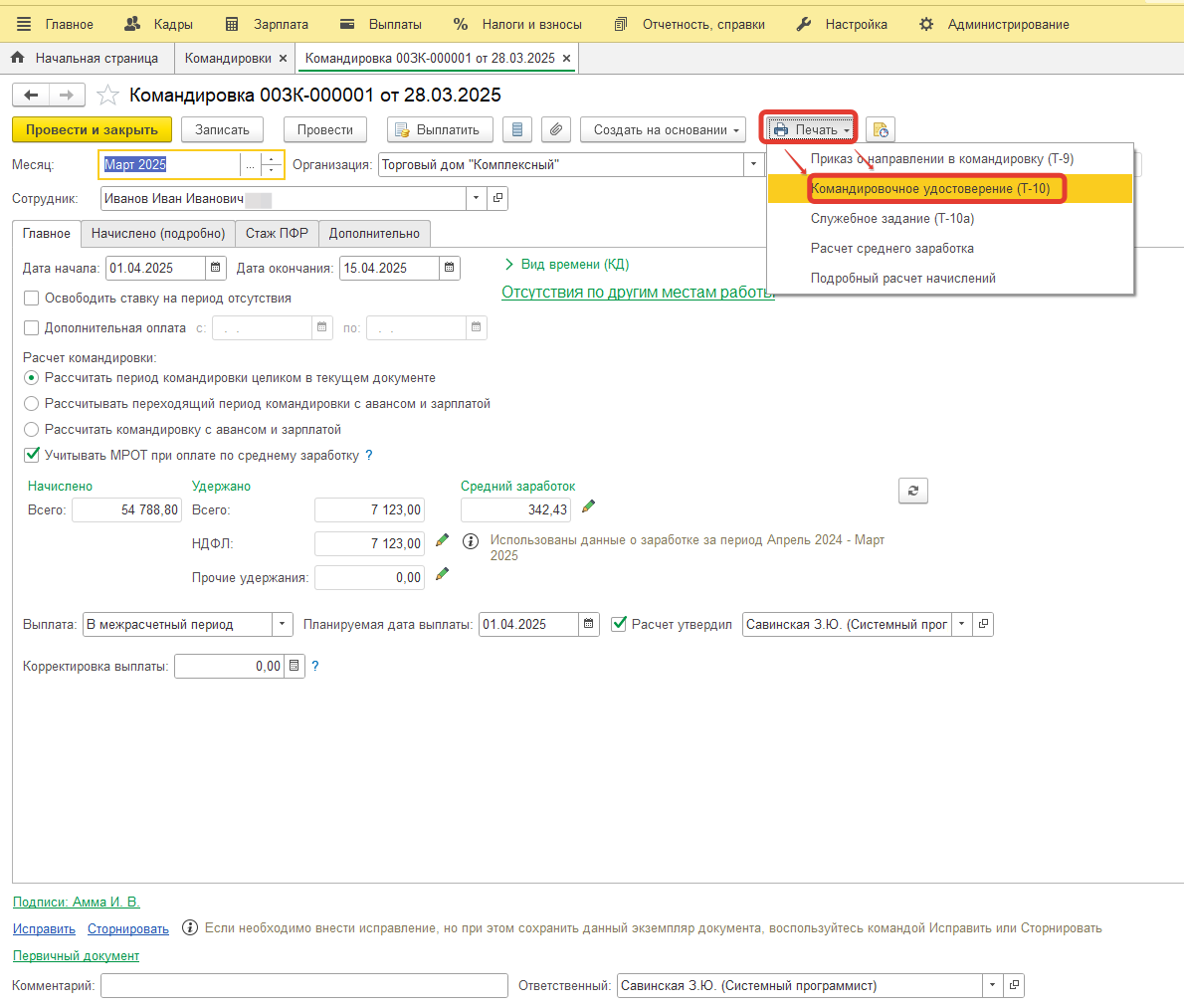 Как в ЗУП распечатать Командировочное удостоверения по форме Т-10?