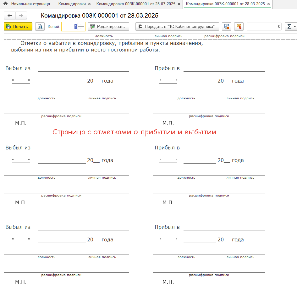 Для того, чтобы эта печатная форма стала доступна, необходимо сделать доступным функционал программы по работе с командировками.