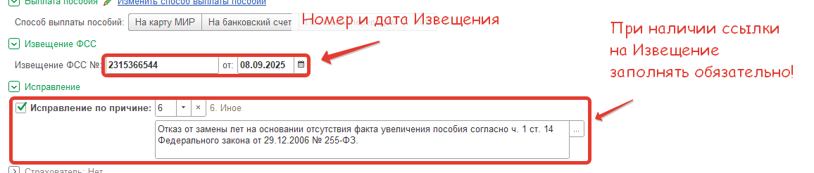 Замена производится по заявлению работника и при условии, что размер пособия увеличится. Это правило предусмотрено в ч. 1 ст. 14 Федерального закона от 29.12.2006 № 255-ФЗ. Если расчет не подтверждает увеличение пособия в следствие замены лет - страхователю направляется Извещение. В случае неправомерности применения замены лет следует отправить новый Ответ на входящий запрос со ссылкой на номер и дату Извещения, в блоке Исправление указать код (например, 06), и заполнить комментарии, основываясь на тексте в таблице. В данном случае установили комментарий - Отказ от замены лет на основании отсутствия факта увеличения пособия согласно ч. 1 ст. 14 Федерального закона от 29.12.2006 № 255-ФЗ.