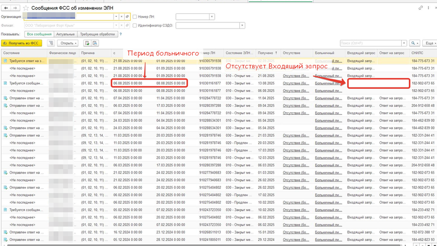 03.09.2025 г. был закрыт больничный лист по сотруднику, но не был получен Входящий запрос по расчету пособия по временной нетрудоспособности. 08.09.2025 г. отправили Исходящее сообщение о страховом случае с видом Пособие по временной нетрудоспособности и указанием номера ЭЛН, сообщения Принято фондом, но Входящего так и нет. В чем может быть причина?