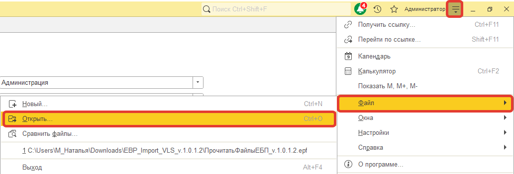 Внешнюю обработку можно открыть через Файл- Открыть и выбрать файл обработки из папки: