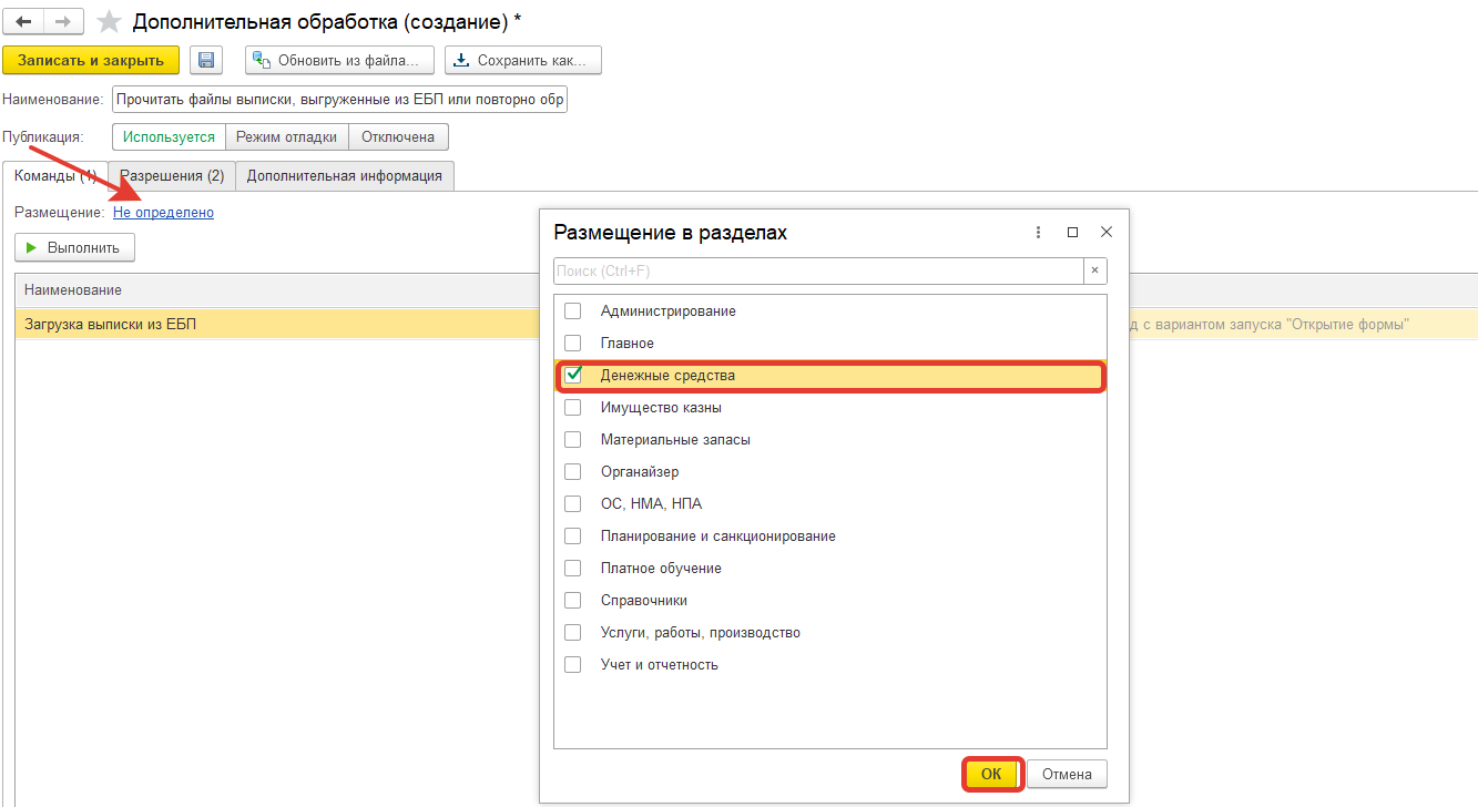 либо для удобства внести ее в разделе Администрирование-Печ. формы, отчеты и обработки-Добавить из файла и выбрать обработку Записать и закрыть. Далее в поле Размещение указать в каких разделах должна быть расположена данная обработка.