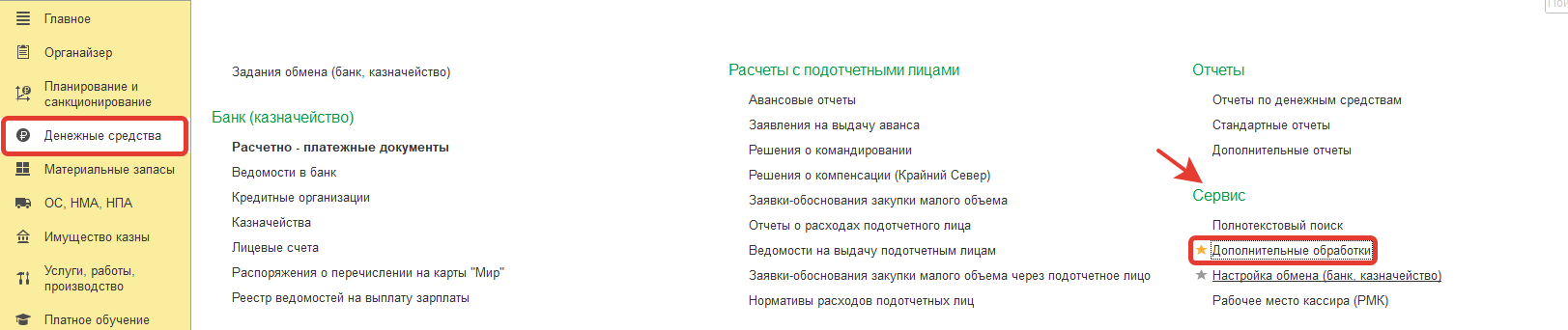 В дальнейшем запускать данную обработку из раздела Денежные средства-Сервис-Дополнительные обработки.