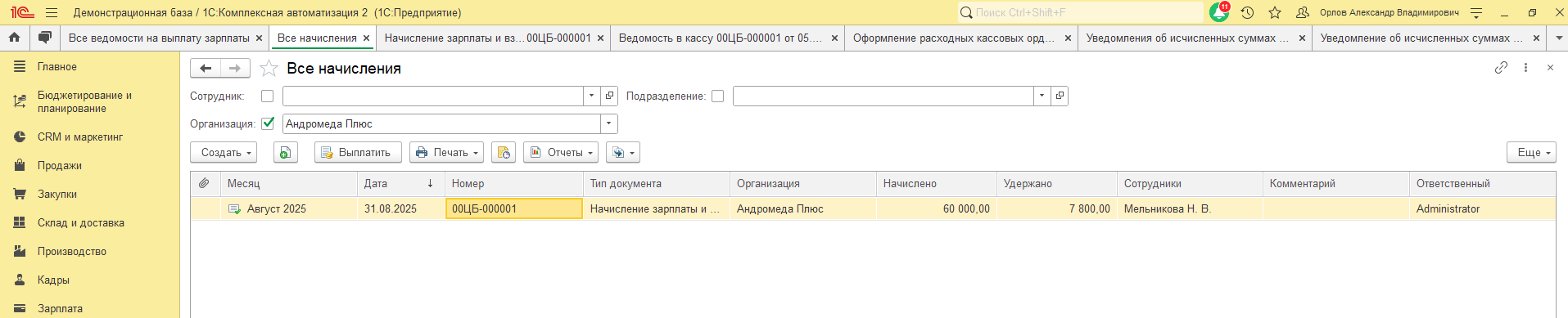 В программе есть Начисление зарплаты и взносов за Август 2025 года.