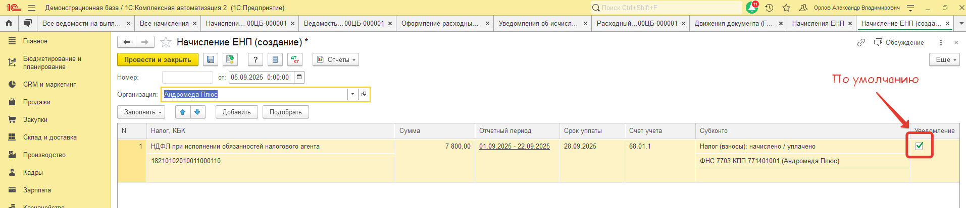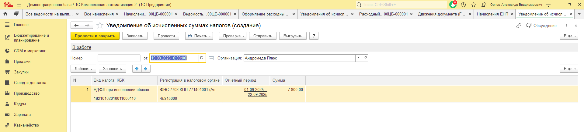 Как мы видим, документ абсолютно корректно отобразил удержание НДФЛ по фактической выплате. Т.к. флаг Уведомление в начислении уже установлен, нам осталось только сформировать и отправить уведомление.