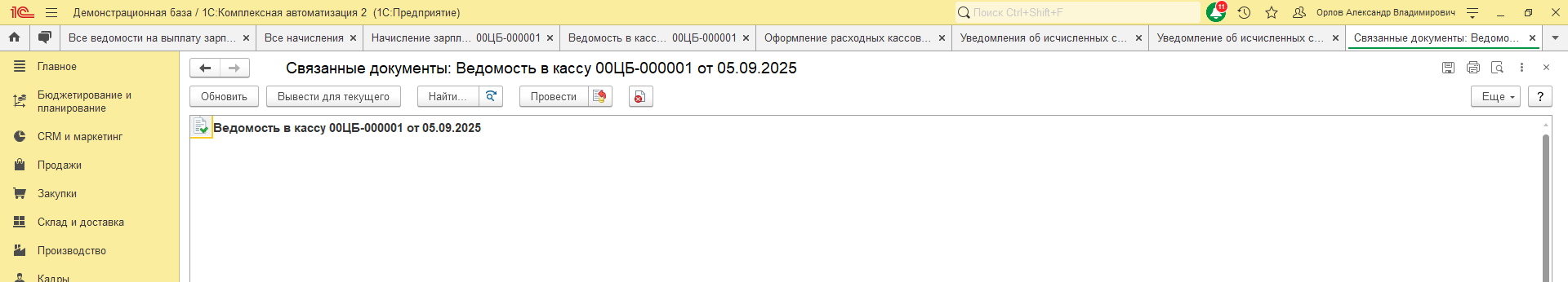 Есть Ведомость в кассу, сформированная на основании этого начисления.