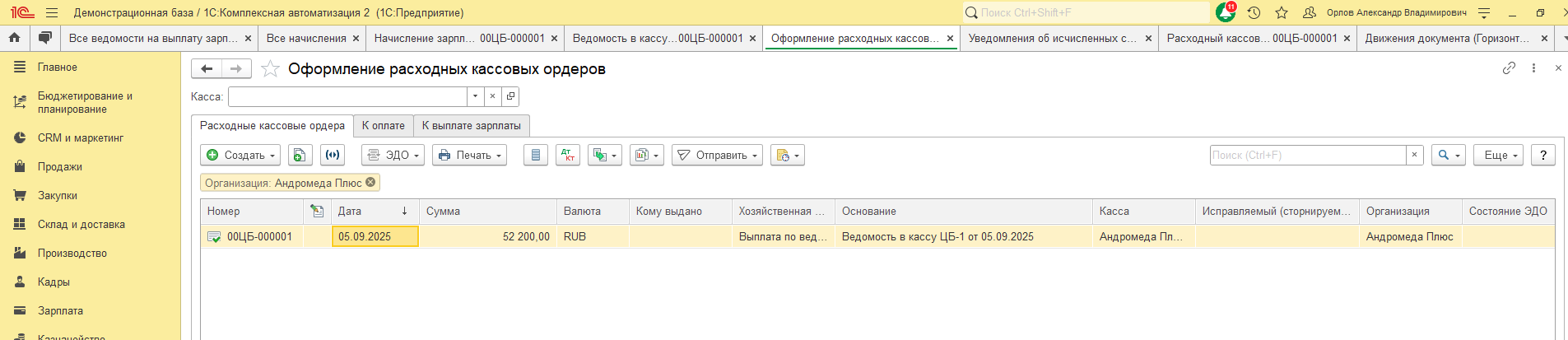 Сформируем РКО на выплату заработной платы, и отразим проводки в регламентированном учете.