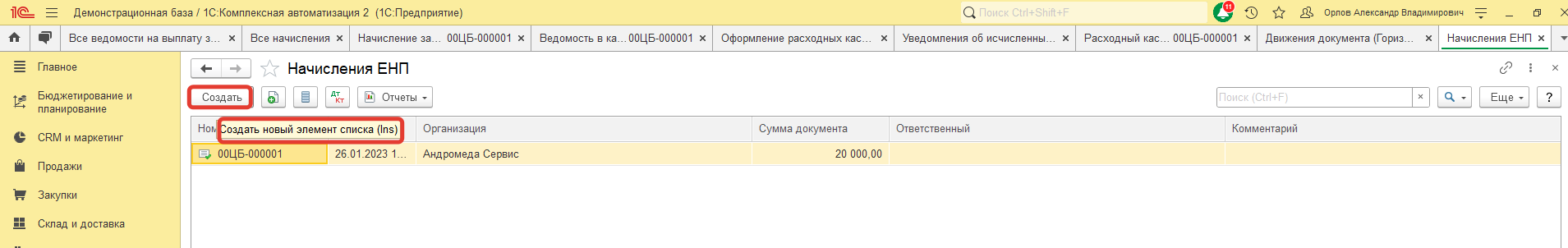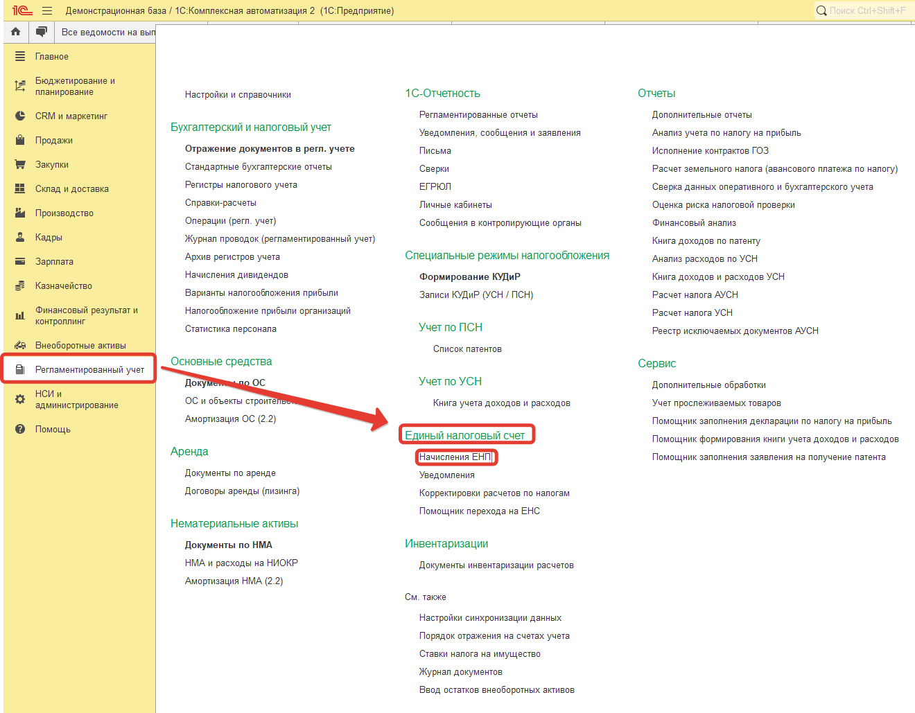 В Комплексной автоматизации автоматически не формируется проводка по переносу сальдо счетов учета налогов и страховых взносов в счет Единого налогового счета, поэтому используется документ Начисление ЕНП.