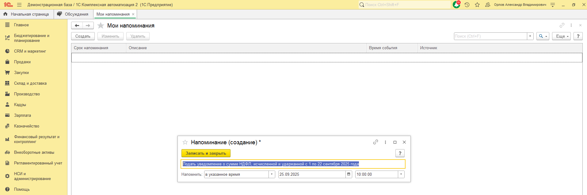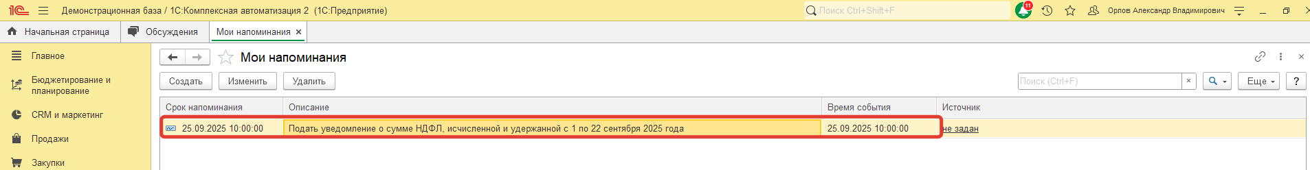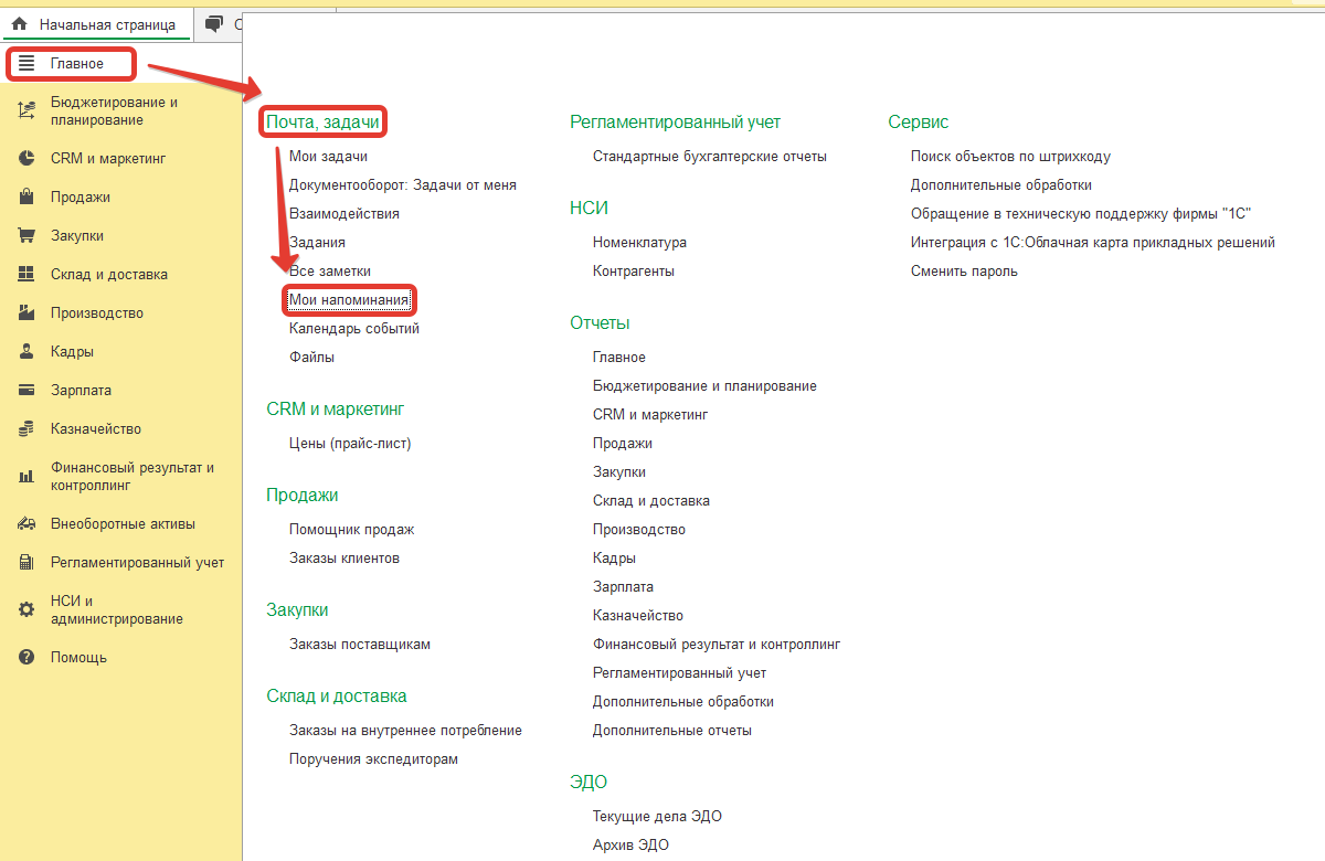 Сформируем напоминания через раздел Главное - Почта, задачи - Мои напоминания.