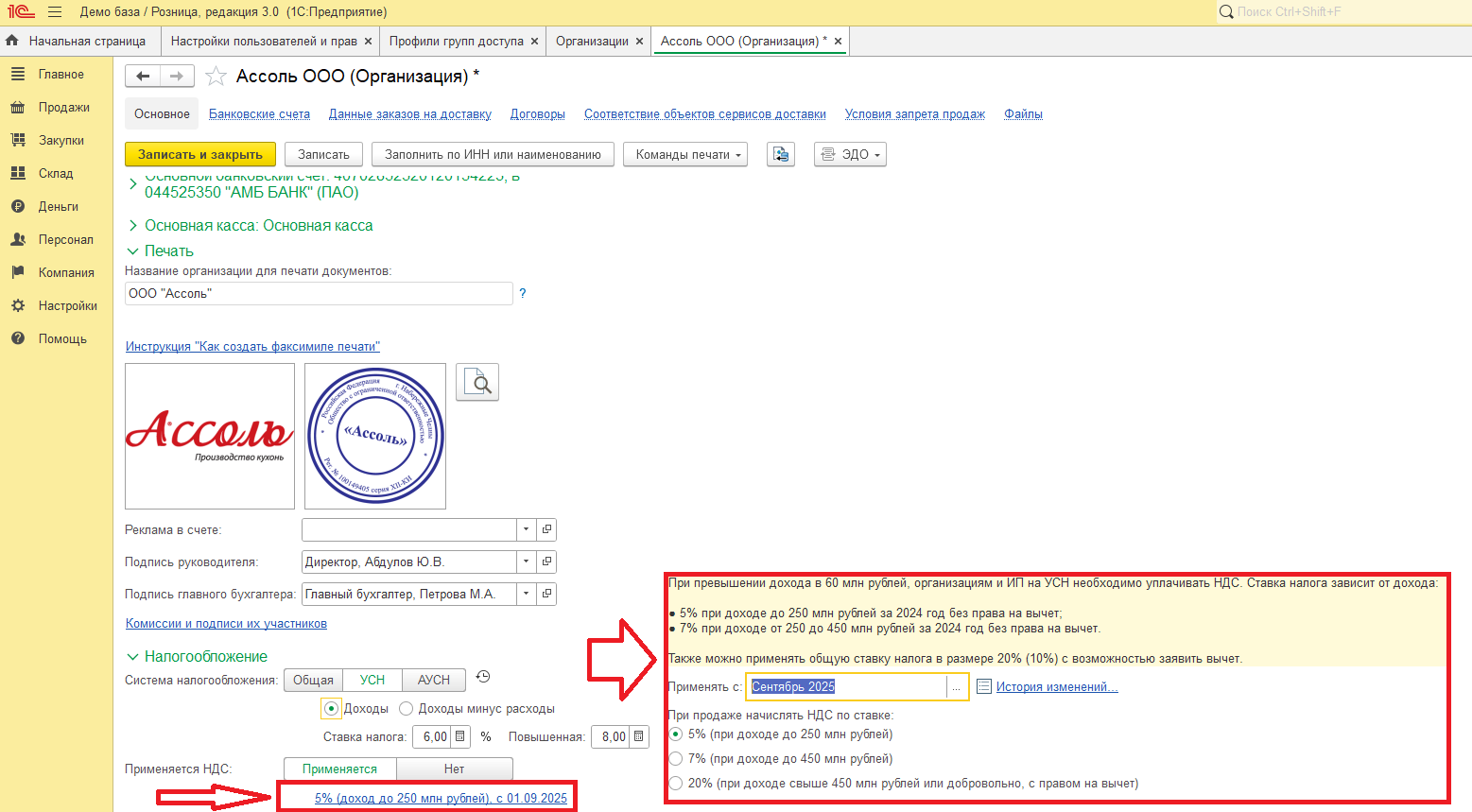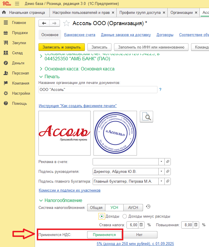 Какие настройки нужно сделать в 1С розница 3.0 если предприятие на УСН становится плательщиком НДС?