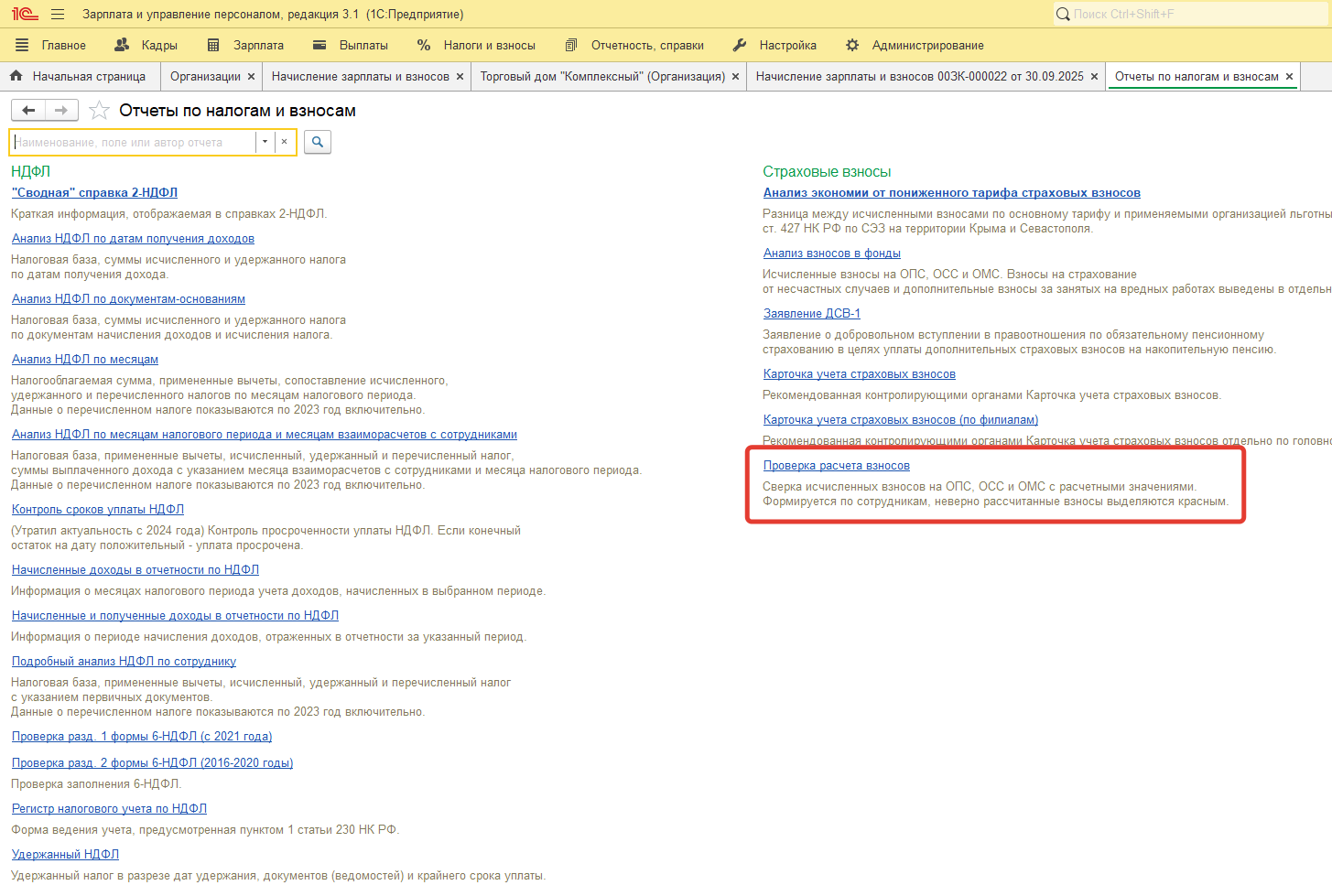 Проверим результат пересчета взносов посредством отчета Проверка расчета взносов.