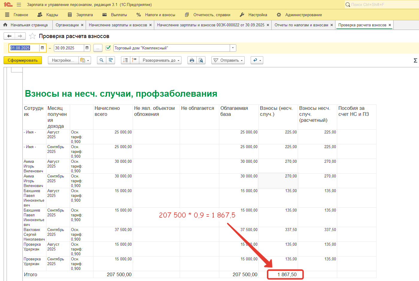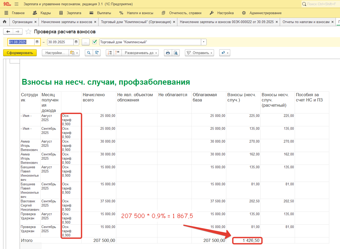 По несчастным случаям установлен тариф 0,9 %, но программа считает меньше, и не выдает ошибок при формировании отчета Проверка расчета взносов. В чем ошибка?