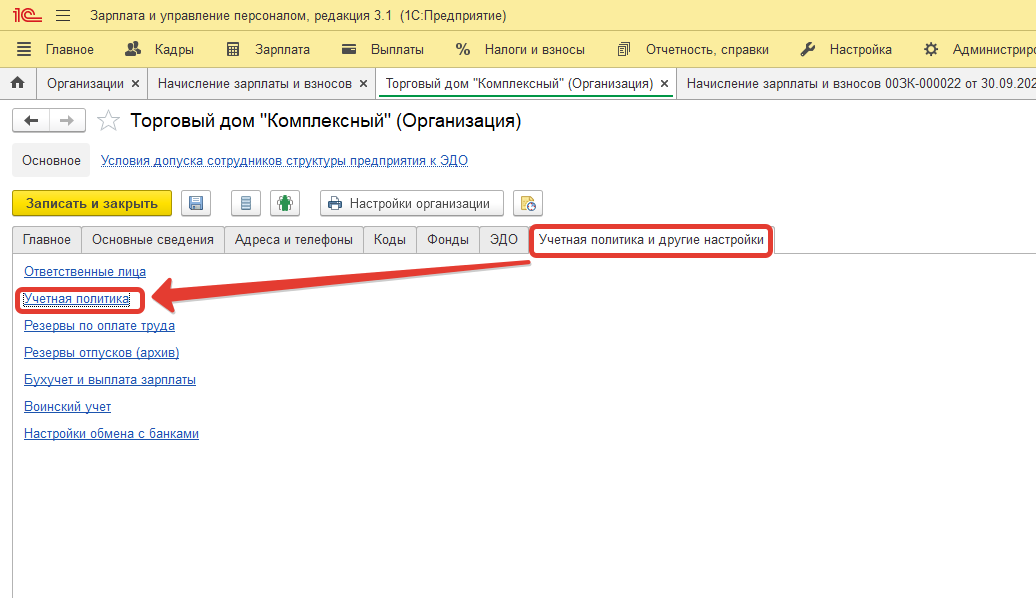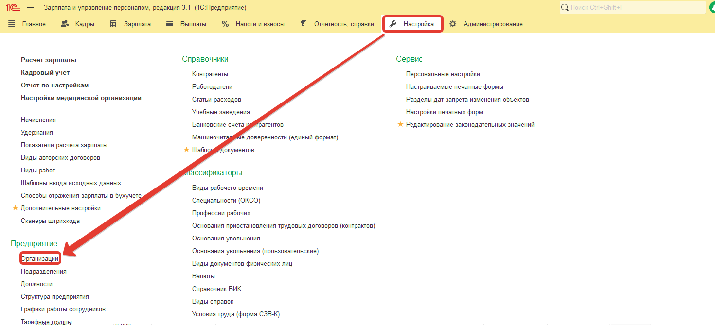 Проверим настройки организации в разрезе установки тарифов взносов на несч. случаи, профзаболевания.