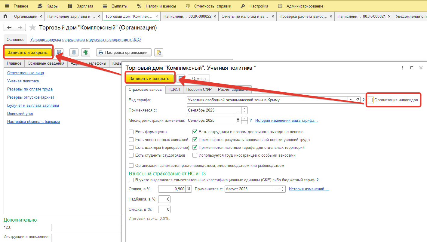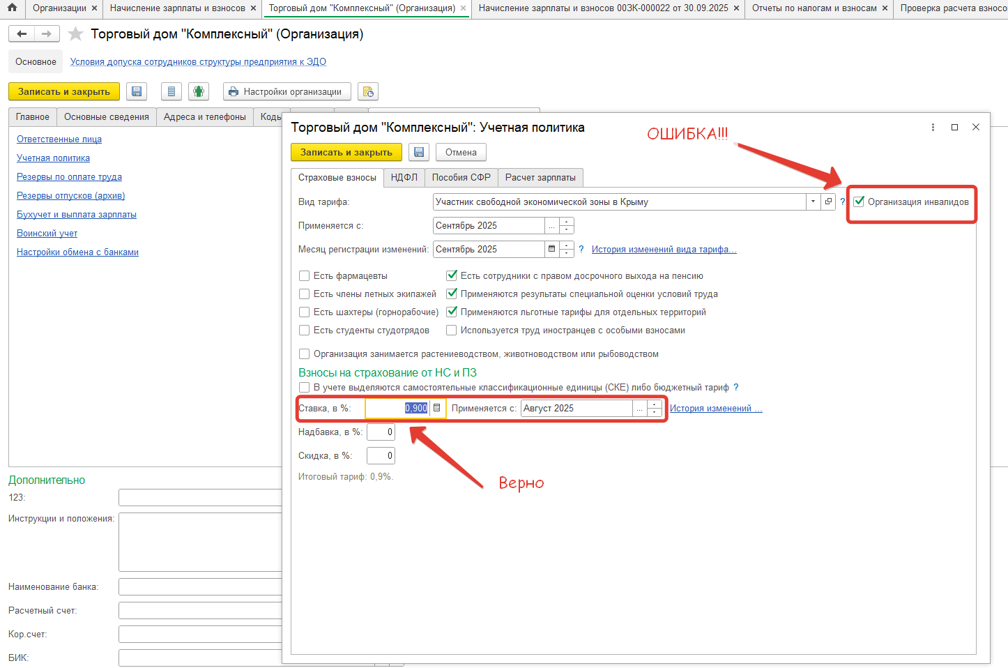 Как мы видим, пользователем допущена ошибка - установлен флаг в ячейке Организация инвалидов. Как только этот флаг устанавливается в настройках организации - к текущему тарифу взносов на несч. случаи, профзаболевания применяется скидка 60 % в соответствии с ст. 2 Федерального закона от 21.12.2021 № 413-ФЗ, ст. 2 Федерального закона от 22.12.2005 № 179-ФЗ, причем применяется она ко всем сотрудникам организации.