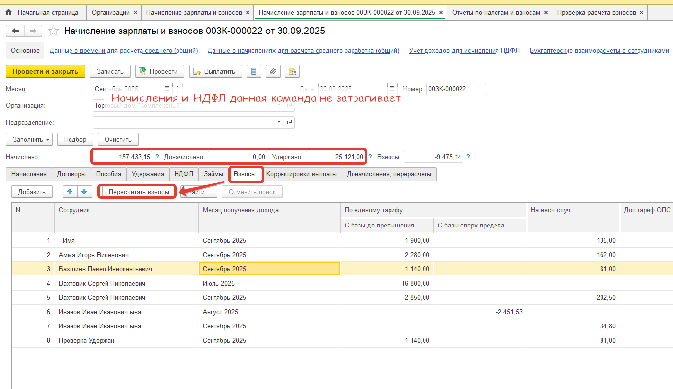 Чтобы исправить ситуацию, следует снять флаг в карточке организации и пересчитать Взносы в документах Начисление зарплаты и взносов с некорректным расчетом.