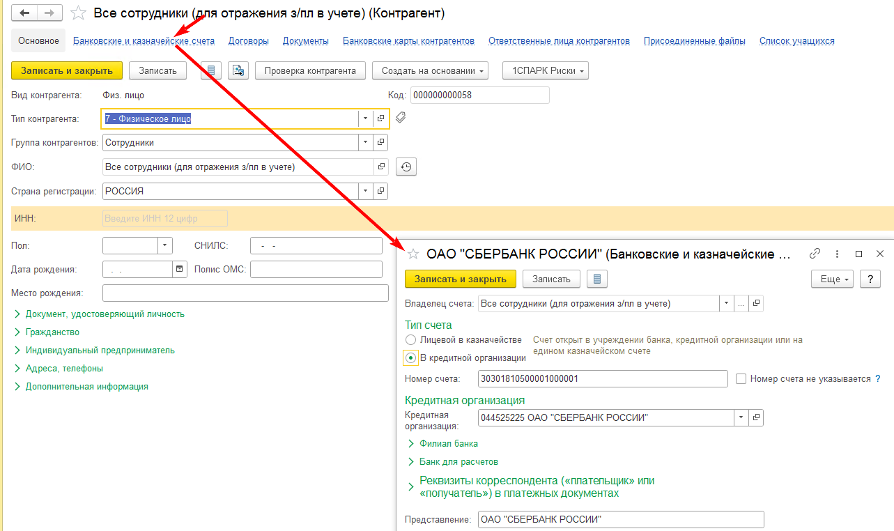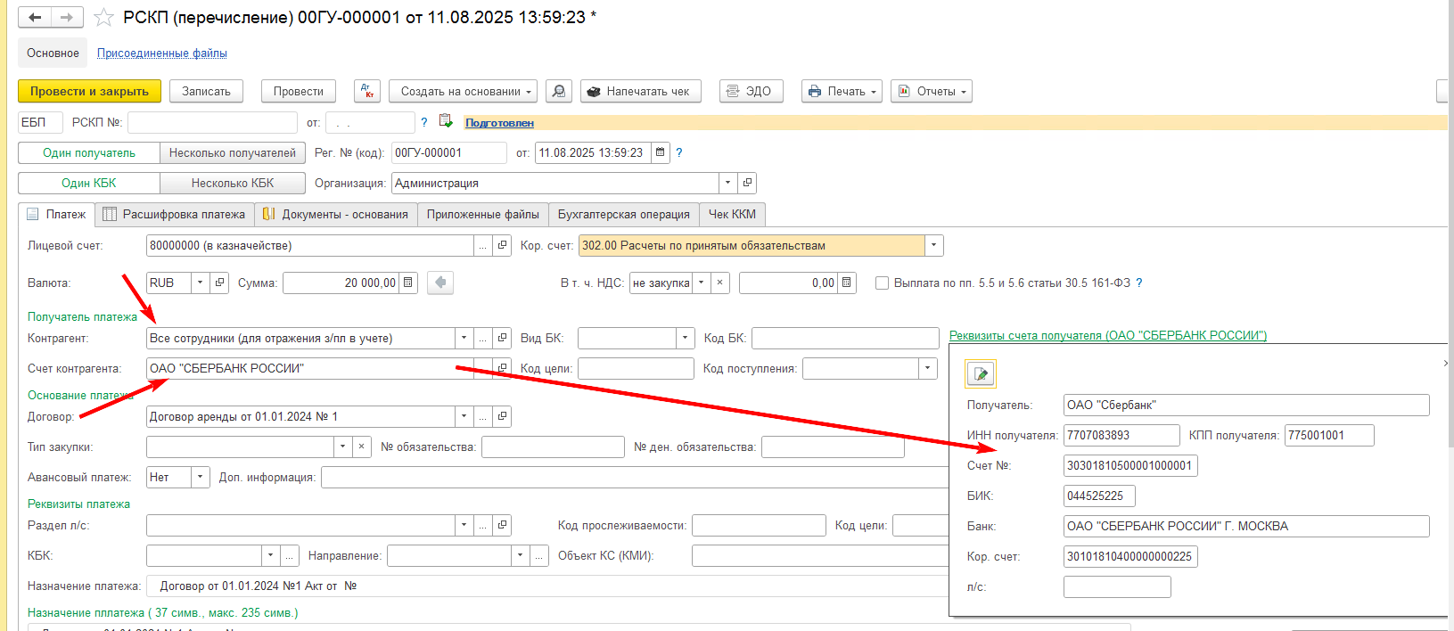 В РСКП выбираем контрагента "Все сотрудники", указываем счет, в реквизитах счета отражается нужное наименование (банк), которое можно редактировать