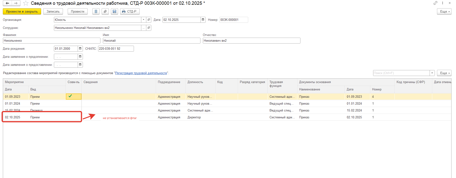 Почему при формировании отчета СТД-Р по старым мероприятиям 2023г. выводится флаг является совместитель, а за 2024г. уже нет, при этом в отчете ЕФС-1 признак совместительства присутствует?