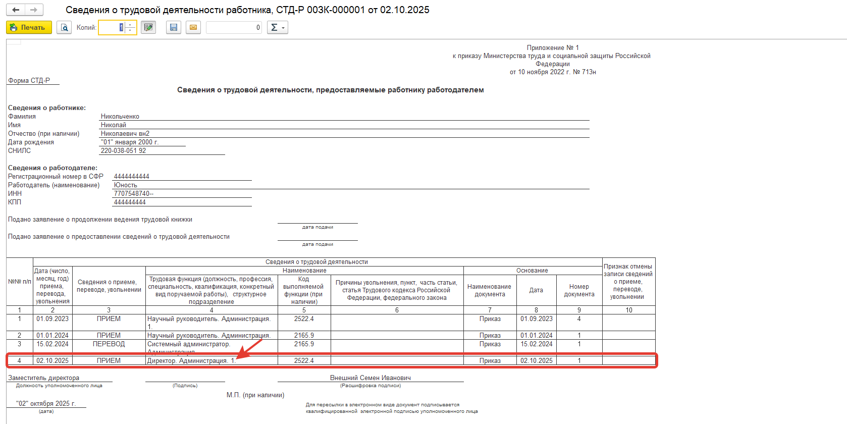 Данные числовые значения в печатной форме СТД-Р отображаются в разделе ведения о трудовой деятельности в колонке 4.
