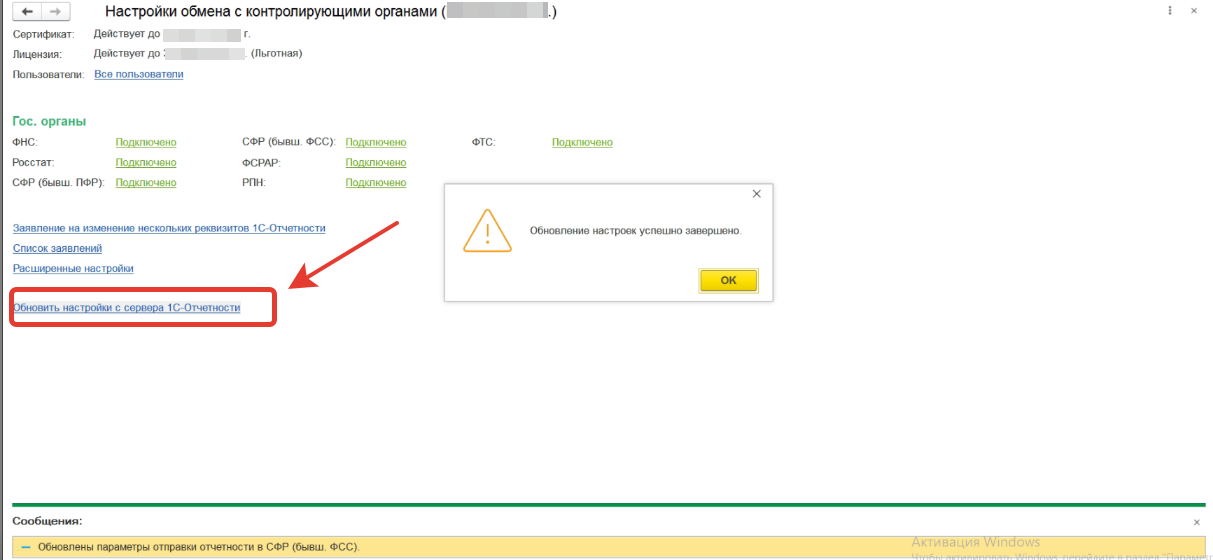 «Отчёты» – «Регламентированные отчёты» – «Настройки» — «Настройки обмена с контролирующими органами» — «Обновить настройки с сервера 1С-Отчетности».
