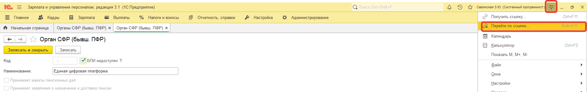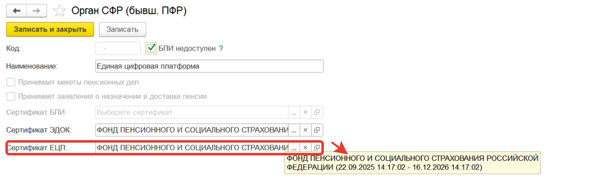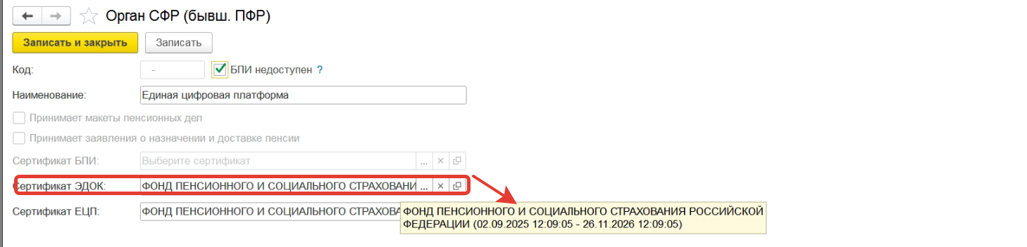 После обновления настроек проверить актуальный сертификат можно в справочнике Органы СФР(бывш. ПФР) по ссылке e1cib/list/Справочник.ОрганыПФР