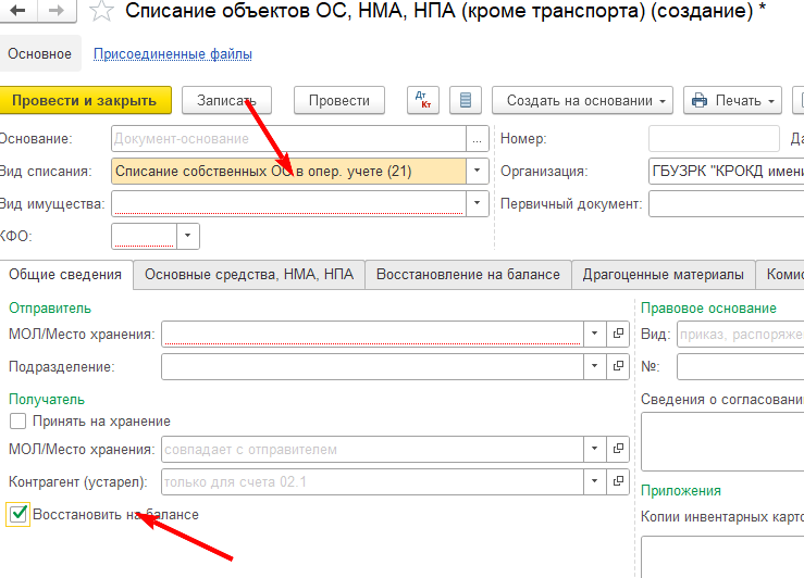 В БГУ восстановление на балансе оформляется документом Списание объектов ОС, НМА, НПА раздела Основные средства с выбором операции Списание собственных ОС в опер.учете (21) и установкой флага Восстановить на балансе.