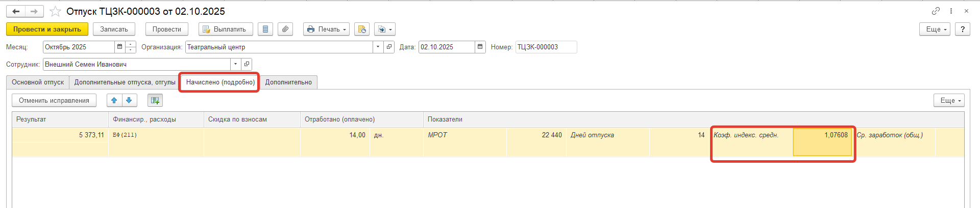 В данном случае коэффициент индексации применяется к окончательно рассчитанному среднему заработку, т.е на закладке Начислено( подробно).