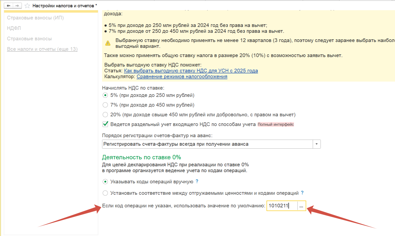 Далее в блоке деятельность по ставке 0% необходимо указать код льготной операции, который будет выбираться программой по умолчанию, если в карточке номенклатуры код не установлен и установлена ставка "Без НДС".