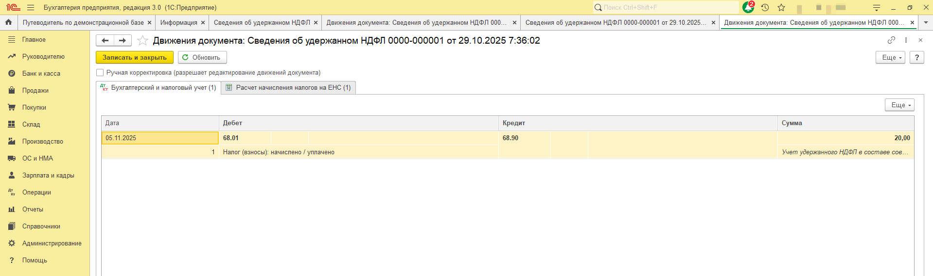 После чего сделать синхронизацию и в программном продукте 1С:Бухгалтерия предприятия подтянется документ Сведения об удержанном НДФЛ и после проведения сделает проводку Дебет 68.01 Кредит 68.90