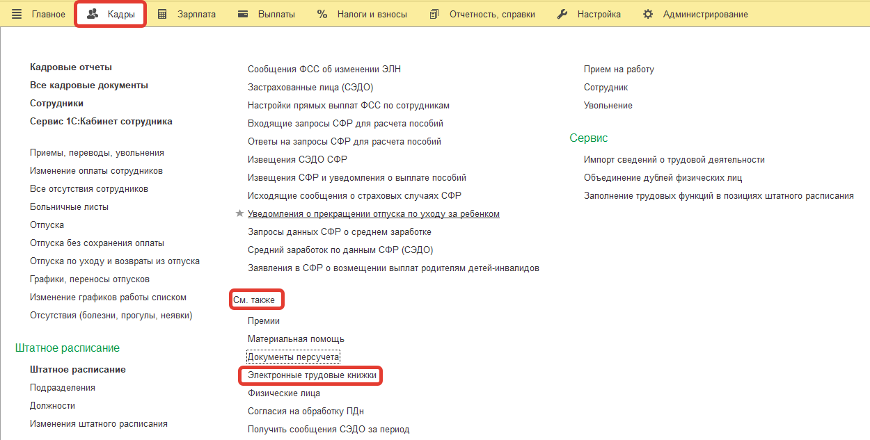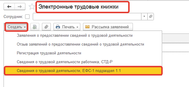 Для формирования отчетов ЕФС-1, подраздел 1.1 кадровику не нужен раздел Отчетность, справки. Функционалом предусмотрено, что кадровик может сформировать в разделе Кадры-см. Также-Электронные трудовые книжки-Создать и выбрать- Сведения о трудовой деятельности ЕФС-1, подраздел 1.1.