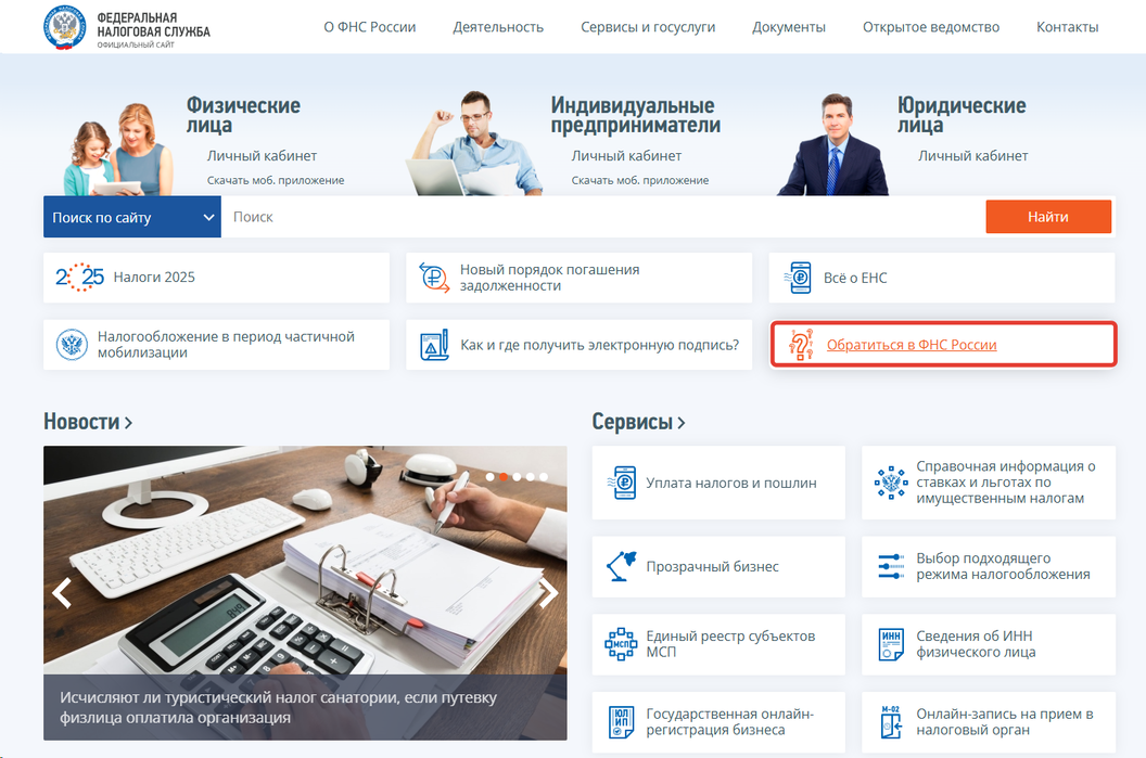 - Из личного кабинета налогоплательщка (организации или ИП) на портале ФНС в разделе Обратится в ФНС.