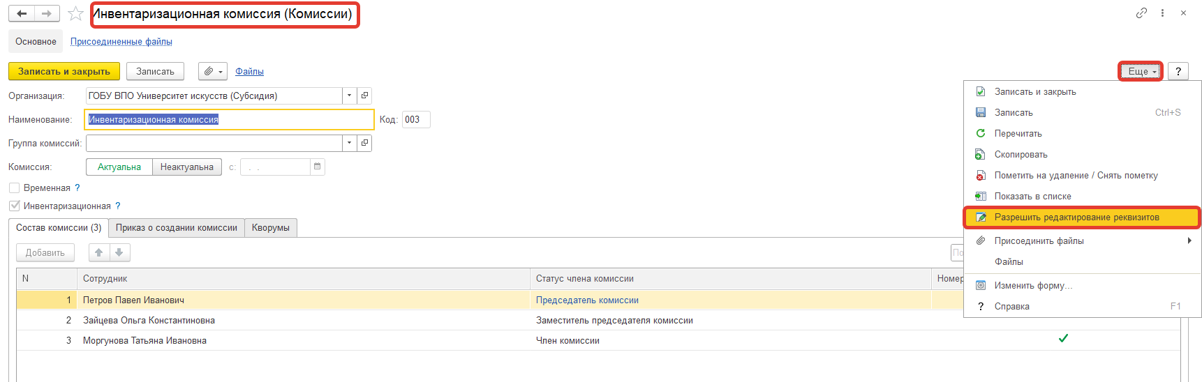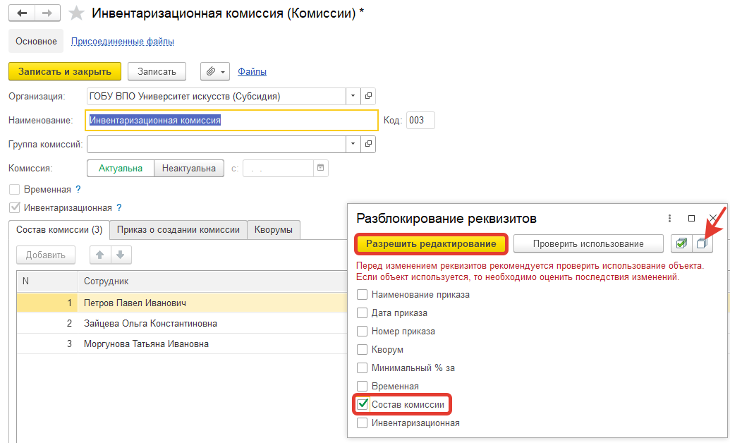 Как внести изменения в инвентаризационную комиссию, недоступны поля для редактирования?