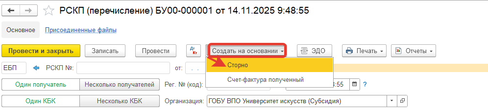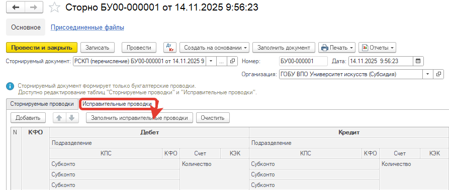В связи с тем, что РСКП (уточнение) не формирует проводок, так же как и ранее Уведомление об уточнении платежа, необходимо открыть документ, который уточняли, к примеру РСКП (перечисление) и создать на его основании документ Сторно, в котором сторнируемые операции будут заполнены автоматически, в разделе Исправительные проводки скорректировать реквизиты, которые уточняли.