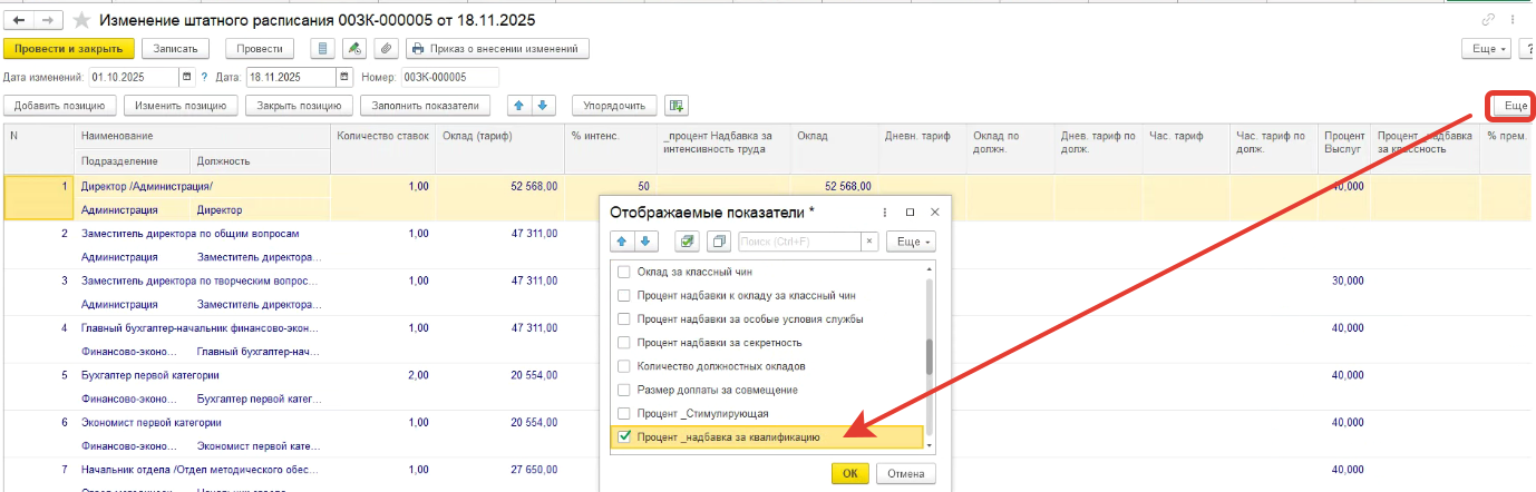 Почему в документе Изменение штатного расписания не выводятся все показатели, из начислений, которые назначены сотрудникам? Как настроить?