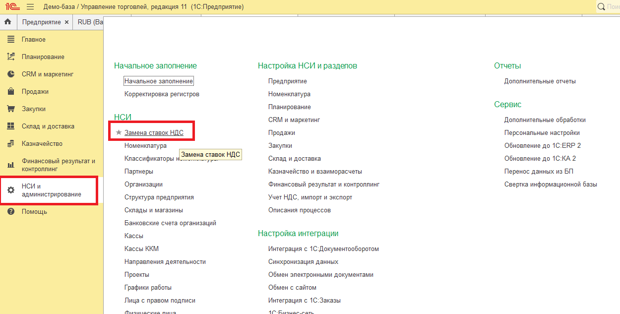 Для этого есть встроенная в 1С обработка. Открыть ее можно в НСИ и администрирование – НСИ – Замена ставок НДС