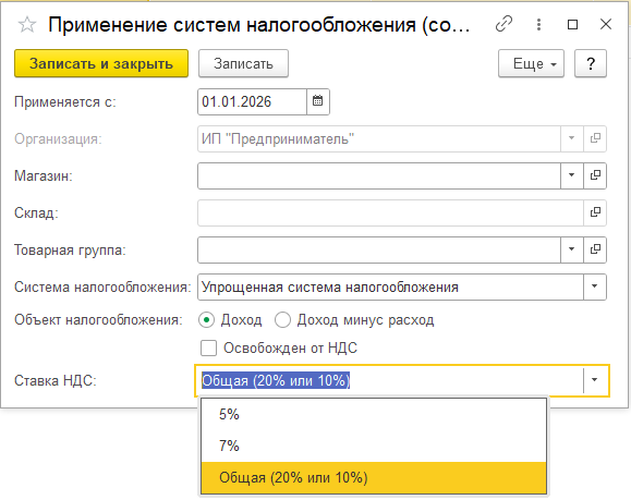 2. Настроить учетную политику организации, в которой указать дату начала применения 01.01.2026 и применяемую СНО