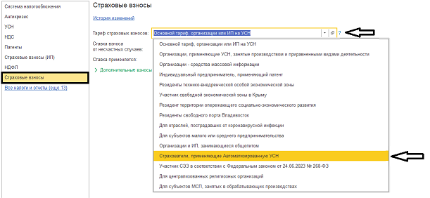 Выбираем "Страховые взносы" - "Тариф страховых взносов" - выбираем нужный тариф "Страхователи, применяющие Автоматизированную УСН"