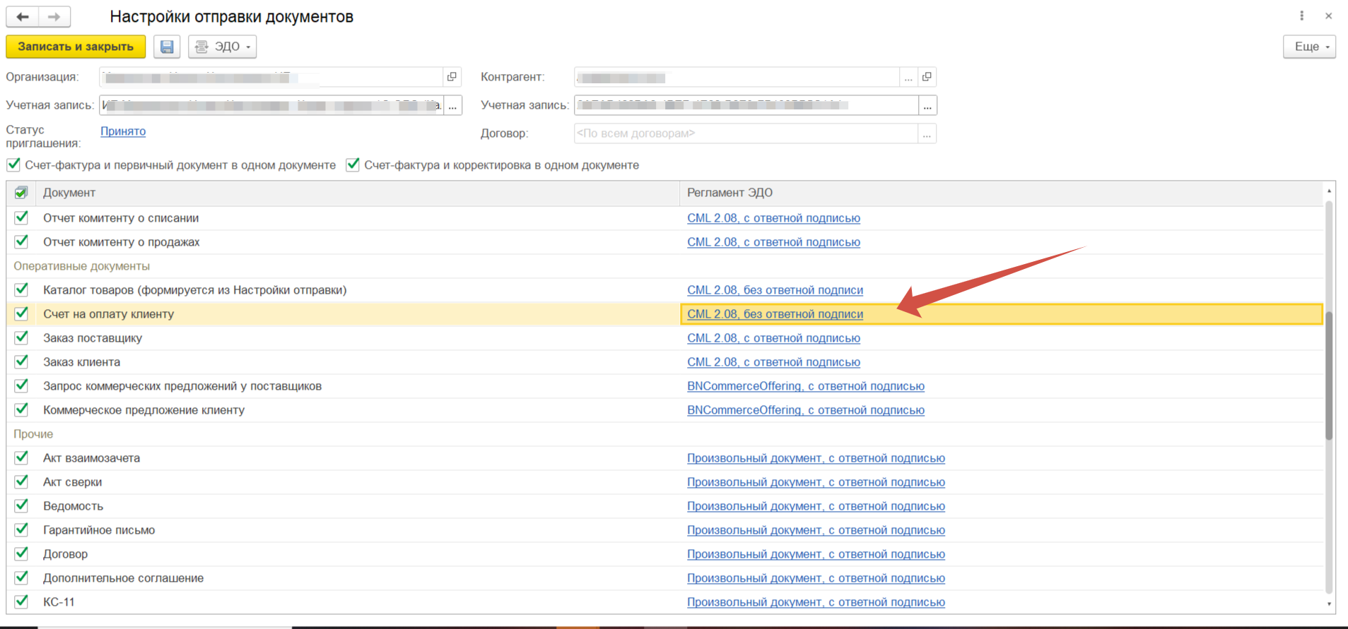 Решение: Зайти в Текущие дела ЭДО - Настройки ЭДО - Настройки отправки, выбираем нужного контрагента, проваливаемся в настроку напротив счета на оплату проваливаемся по гиперссылке CML 2.08,без ответной подписи