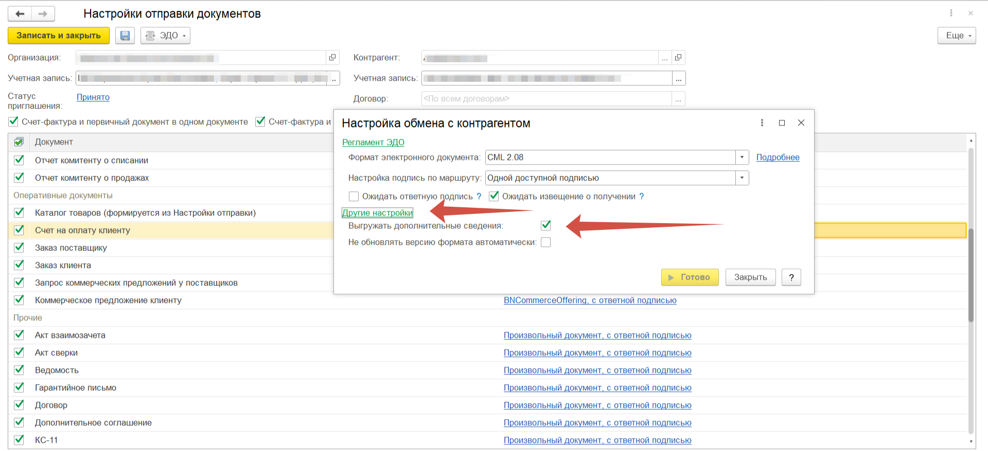 Далее выбираем Другие настройки - Ставим галочку "Выгружать дополнительные сведения"