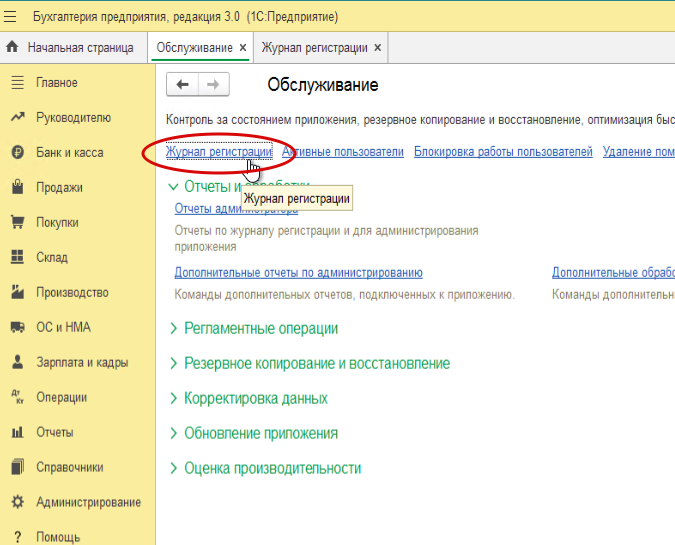 По ссылке "Журнал регистрации" откроется его стандартная форма.