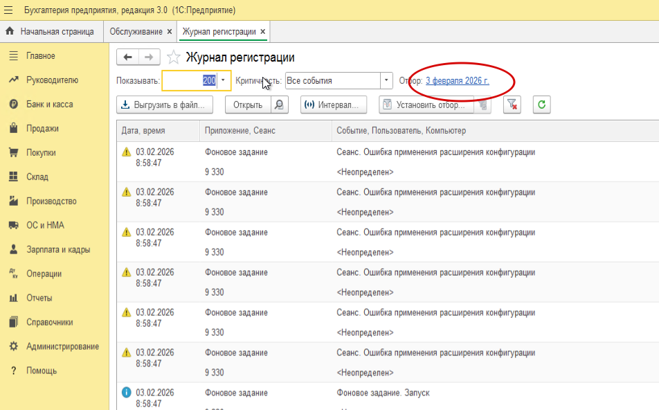 После чего журнал регистрации нужно будет промотать максимально вверх. Дата создания будет обозначена событием "Данные.Добавление"