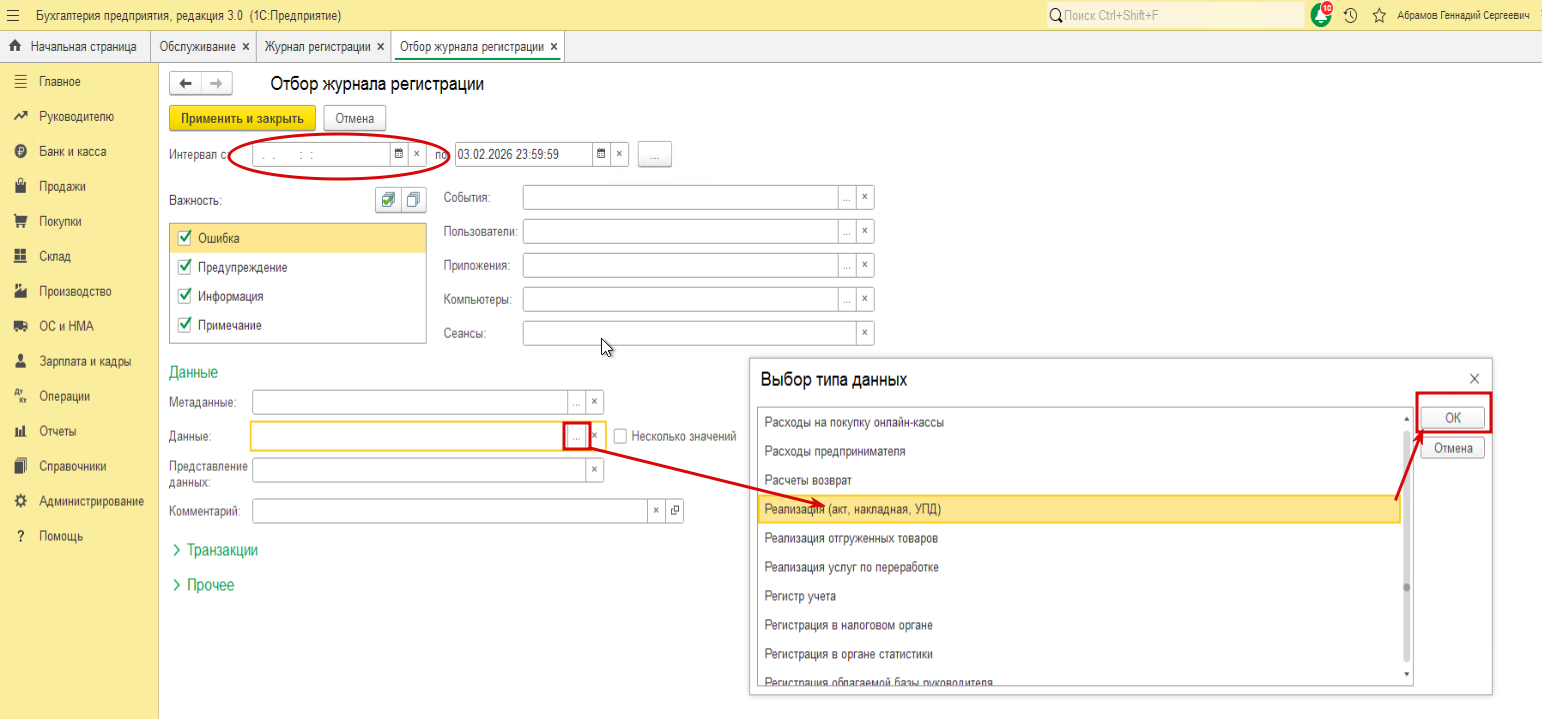 В открывшейся форме удалите значение из поля "Интервал с:" и в поле "Данные" нажмите "Выбрать". Откроется список выбора типа документов. Найдите нужный тип документов, после чего нажмите ОК.