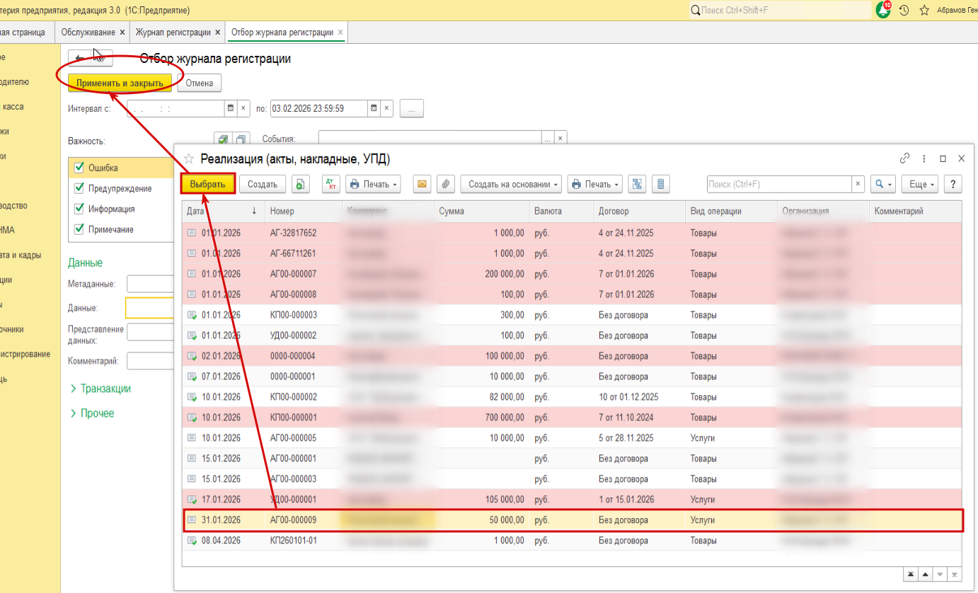 Появится форма для выбора конкретного документа. Выберите его курсором, нажмите "Выбрать" и "Применить и закрыть".