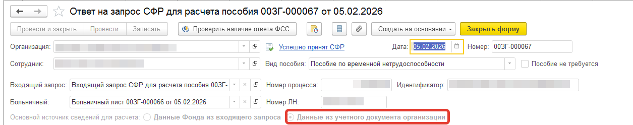 В этом случае можно сформировать Ответ на запрос СФР для расчета пособия и установить переключатель Данные из учетного документа организации и отправить в СФР.