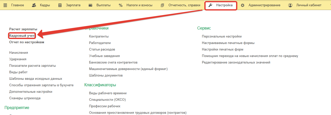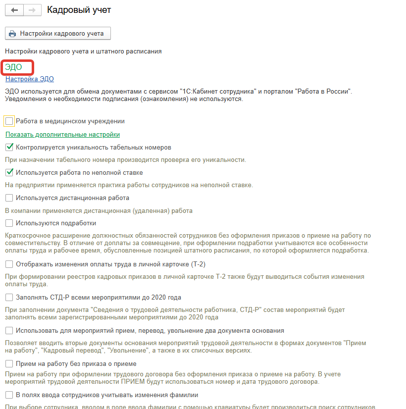 Теперь настройка подключения к обмену с порталом Работа в России находится в блоке ЭДО подраздела Кадровый учет раздела Настройка.