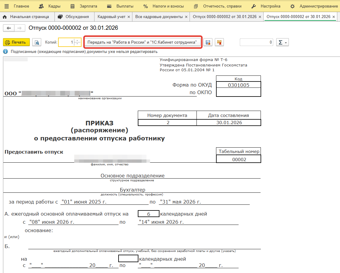 После настройки обмена документами с порталом Работа в Росси в печатных формах докментов появится кнопка Передать на "Работа в России" и "1С:Кабинет сотрудника".